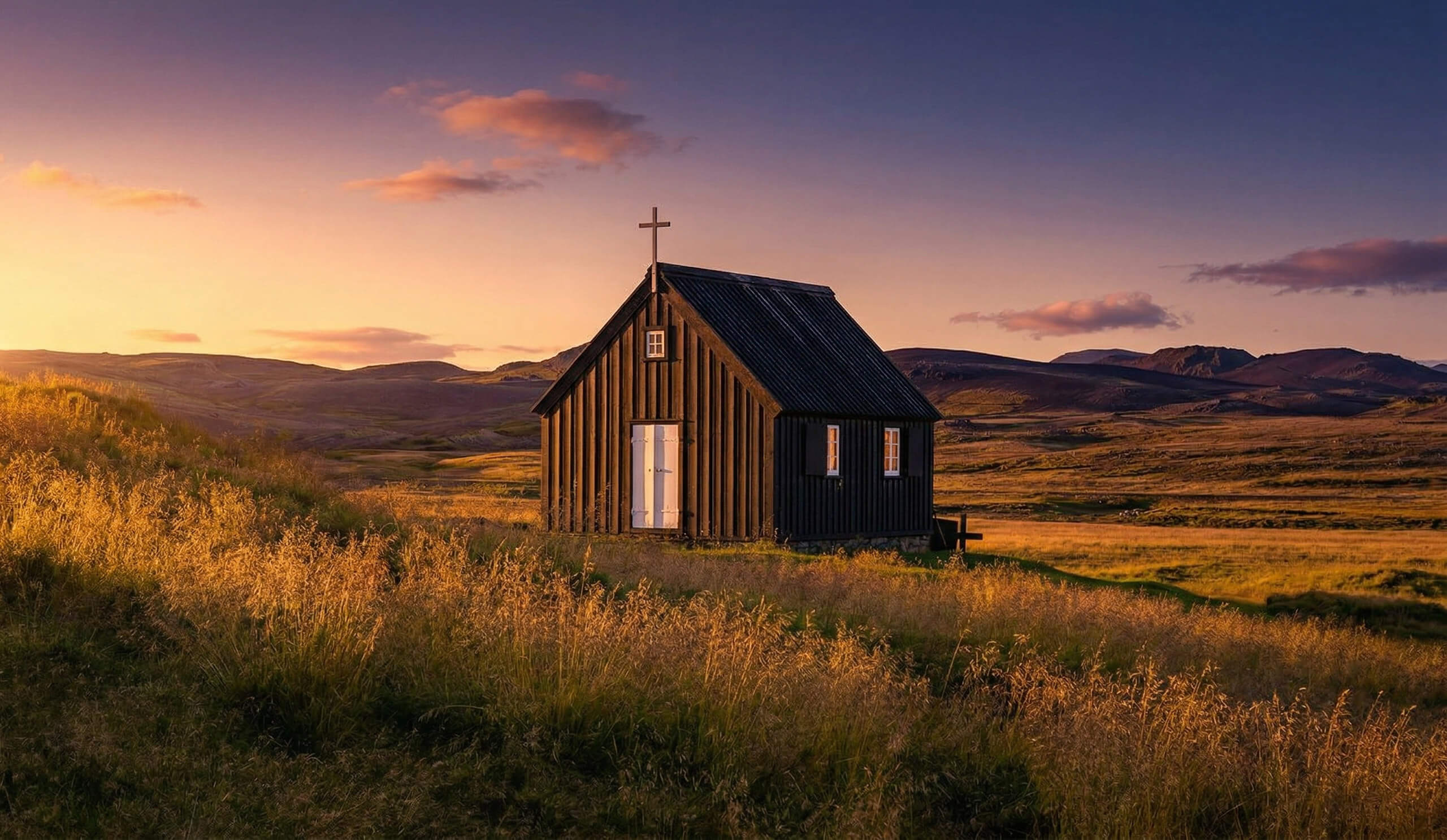 Zastávka u ikonického historického dřevěného kostela, který se tyčí na svahu nad geotermální oblastí.